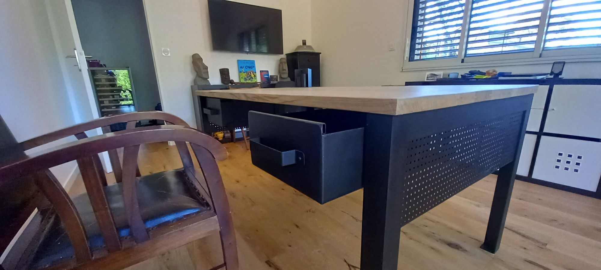Découpe du plateau de table en deux et création de pieds (photo de gauche).